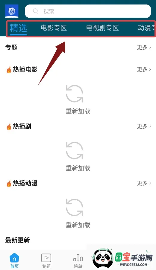 1、进入应用主页后,可在精选、电影、电视剧及动漫专区浏览分类内容。