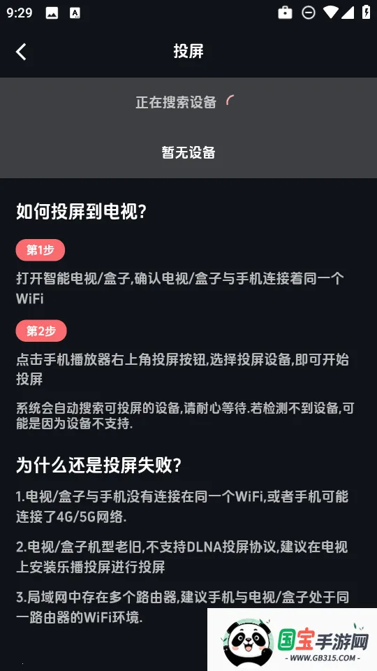 3、然后确保手机和投屏设备在同一wifi下,系统会自动搜索可投屏的设备,请耐心等待.若检测不到设备,可能是因为设备不支持。
