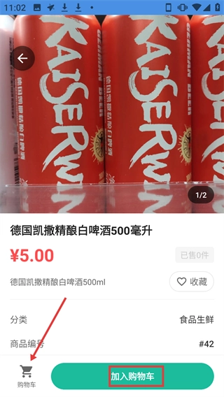 在购物车中勾选德国凯撒精酿白啤酒500毫升后,点击去结算按钮即可进入订单处理流程。