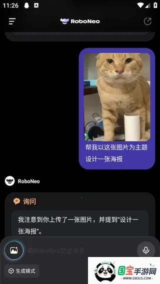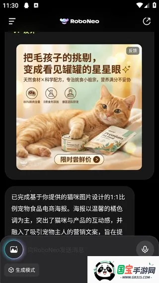 2、向RoboNeo提出你的编辑需求,比如以下图为例,要求根据图片生成一张1:1的海报。