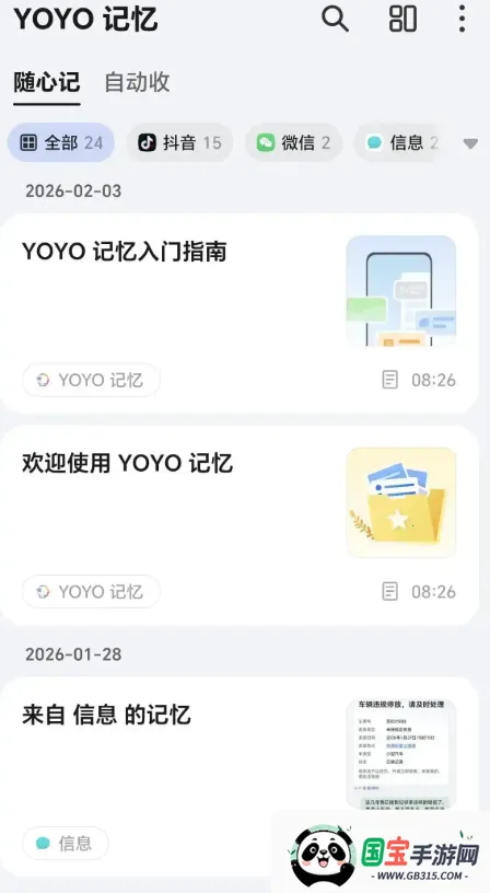 想知道YOYO记忆收藏怎么查看吗?其实很简单。随时打开收藏空间,就能看到被手机助手自动归类的内容啦。这里收纳了通过三指下滑等方式保存的各种内容,像文字、图片、链接等。随心记中则有你从各个app里手动保存的内容。