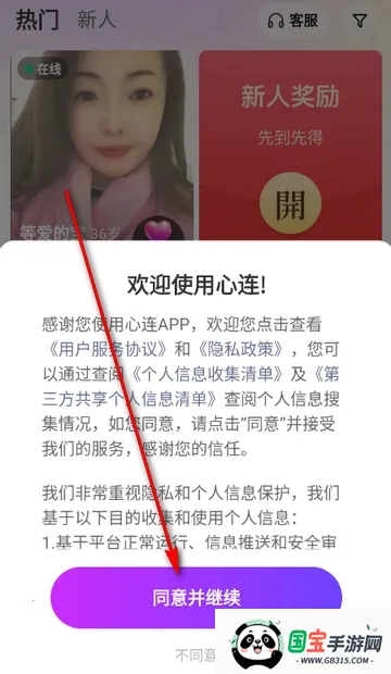 1、打开心连app,点击同意隐私政策