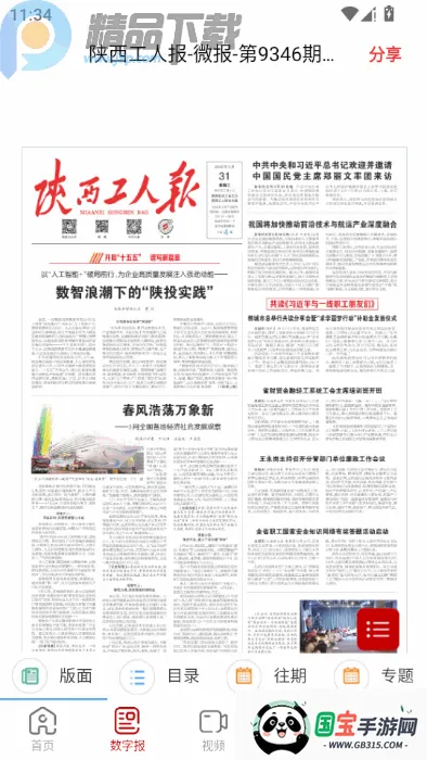 陕工报新闻平台是陕西工人报社打造的官方新闻客户端,聚焦工会动态与职工权益。它提供政策解读、劳模事迹、技能提升等多元内容,支持短视频、数字报等全媒体形式,助力职工随时随地获取权威资讯与便捷服务。其使用方便,点击同意服务协议后,可查看首页热门内容,下滑查看最新发布新闻。数字报电子版查看也简单,点击数字报页面,再点击目录选择内容跳转即可。平台功能丰富,在工园页面能看到其他用户动态,视频页面可查看最新新闻视频,是职工获取资讯的优质选择。