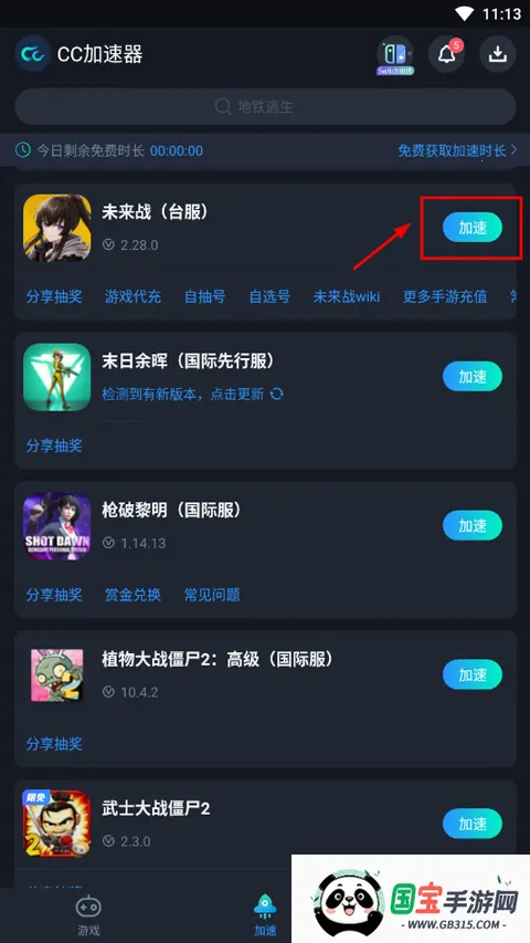 1、打开CC加速器或者其它的手游加速器,找到未来战官方版,点击右侧加速;