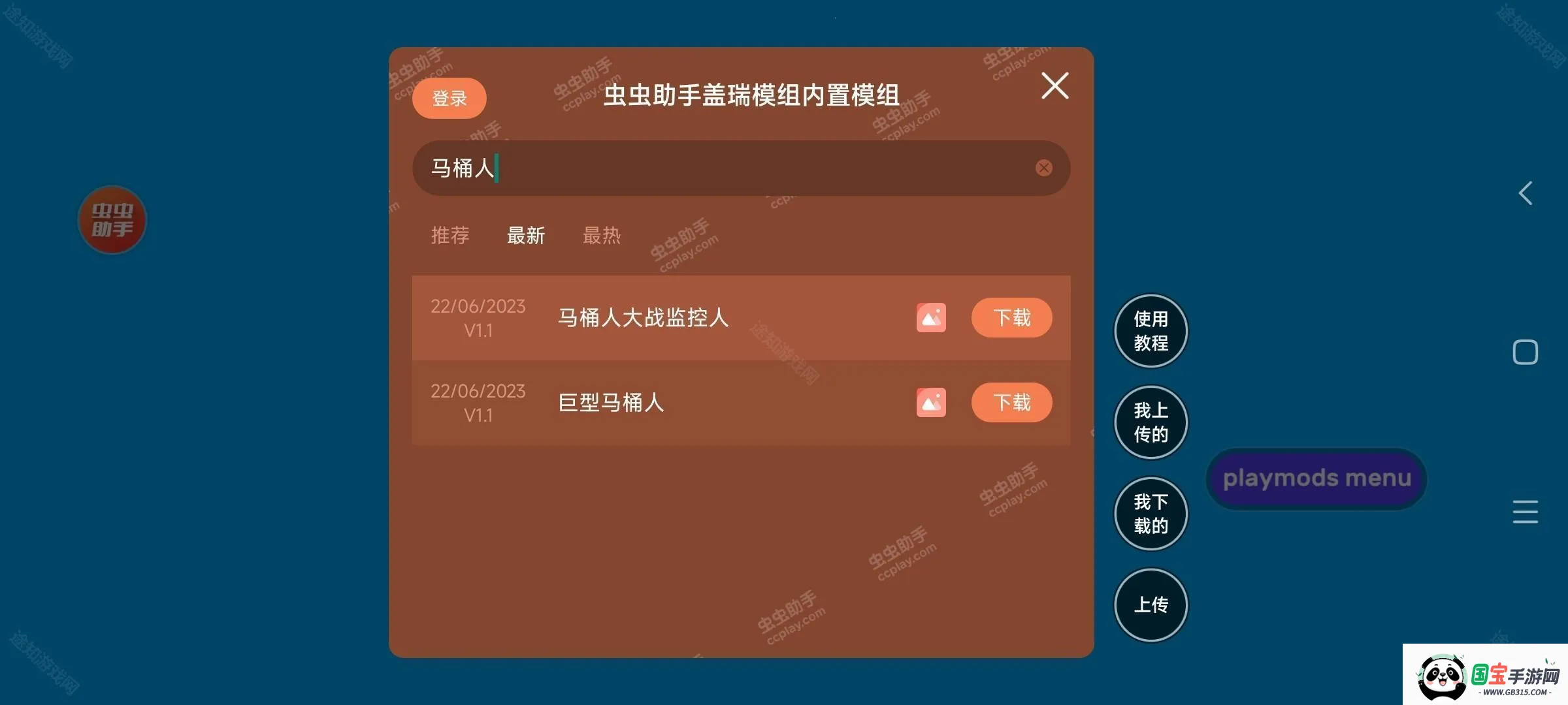 2、点击红色的虫虫助手按钮,然后在搜索框搜索马桶人。