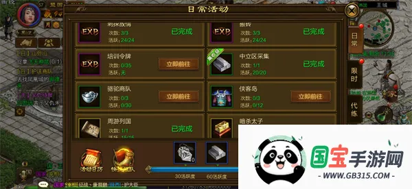 日常活动中有各种日常任务,中立区采集可以获得硬皮、秘银,周游列国奖励藏宝图有几率挖到硬皮、秘银,暗杀太子则可获得魂魄石,BOSS猎杀可获得秘银、硬皮、升级宝石。日常任务奖励的宝箱开启也有概率获得硬皮、秘银、魂魄石。完成日常任务会增加活跃度,达到一定活跃度即可领取秘银、硬皮、魂魄石、升级宝石奖励,日常任务每天一定要完成。