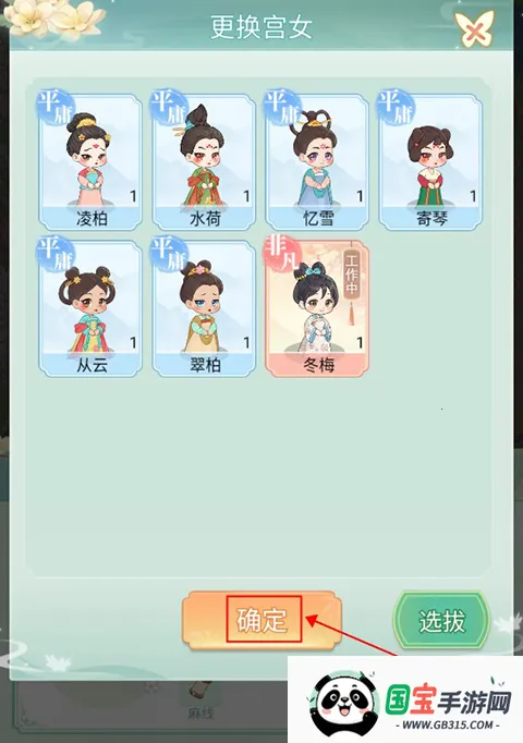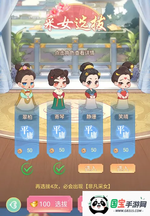 1、玩家点击右下角的选拔即可进行采女的选拔,选择合适的采女加入宫中进行工作。
