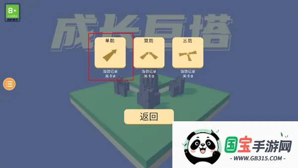 2、有三种塔防玩法模式:单防、双防、三防,以“单防”玩法为例。