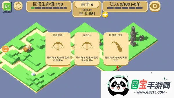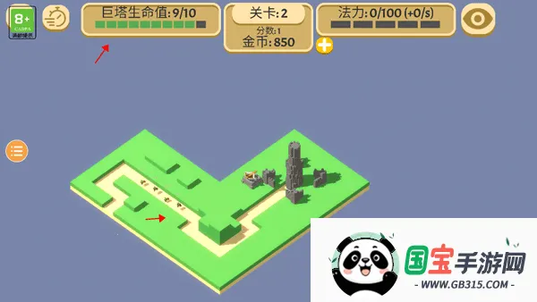4、当有敌人攻进去宝塔时,上方的巨塔生命值就会开始减少,你要做的就是通过已有的金币在巨塔附近设置防御武器,去攻击那些侵略我们巨塔的敌人。