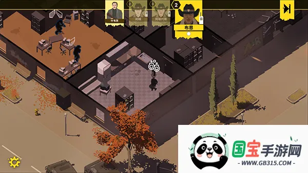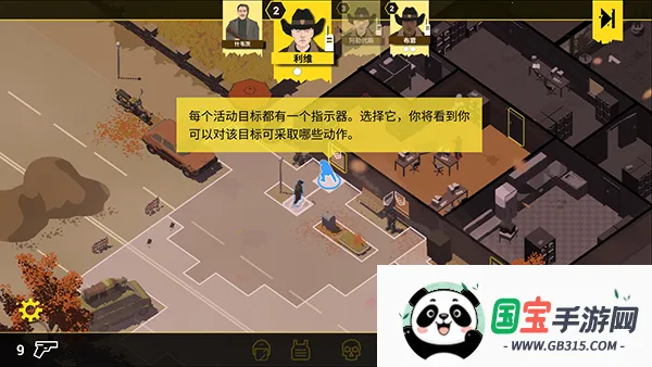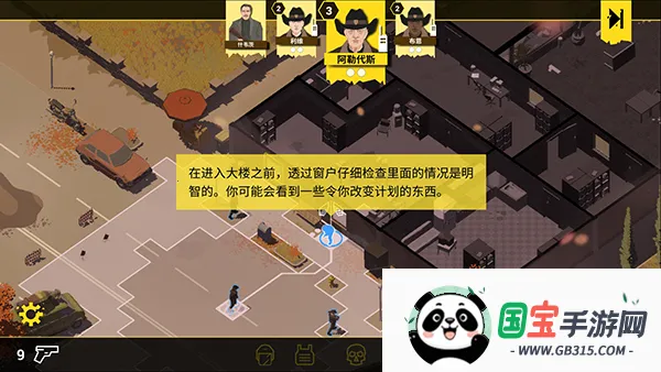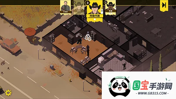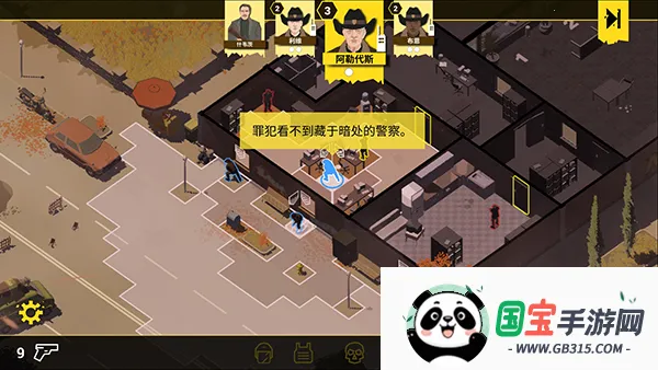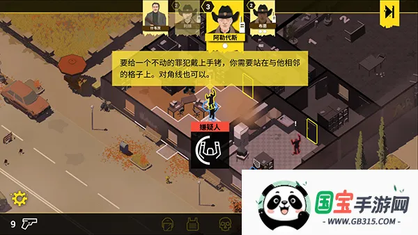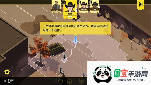 4、如图,提示接近银行大楼,点击图中标记的方块,一个警察通常每回合可执行两个动作,短距离移动会用掉一个动作,需要合理安排规划,