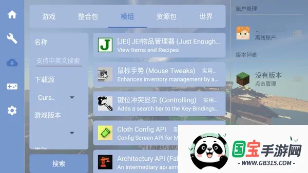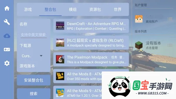 1、在启动器中点击整合包栏目可以看到详细的整合包资源;选择模组可以任意下载模组,这里支持中文英文搜索,可以按下载源,游戏版本,类型等等进行挑选