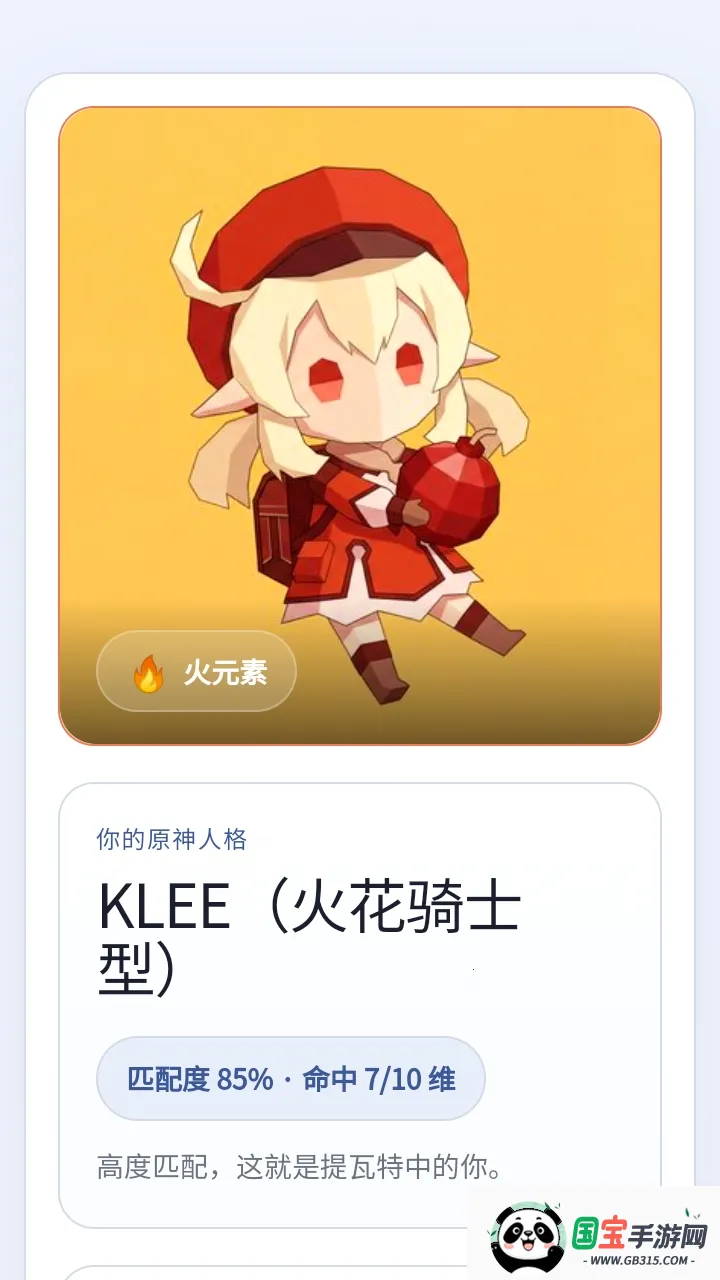 1、独特人格映射:基于原神游戏世界观与角色设定,结合SBTI框架,将玩家游戏行为偏好与现实情绪状态映射为不同类型人格,如KLEE火花骑士、ZHONGLI岩王帝君型、TARTAGLIA公子型等,让玩家在熟悉的提瓦特世界中完成测试,增强代入感。