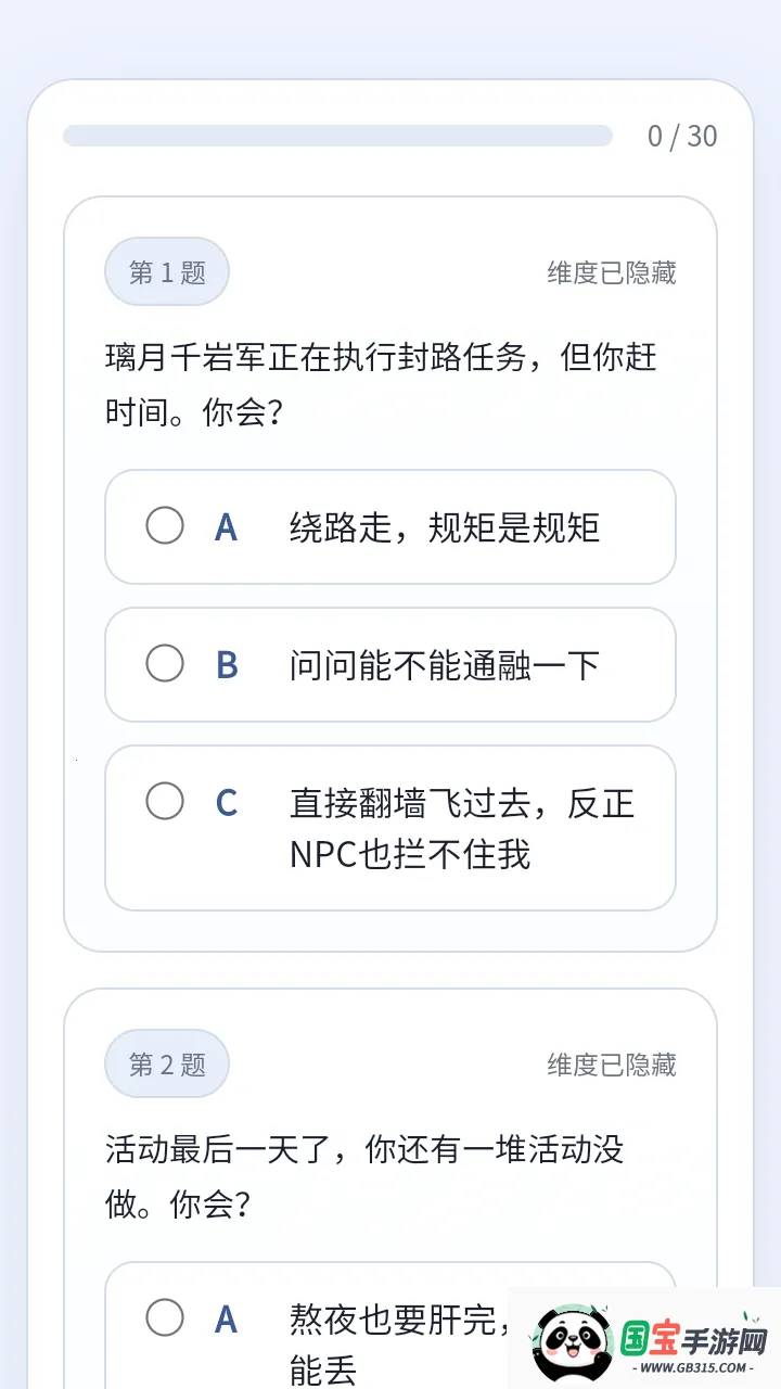 2、然后就会有关于原神的30个测试题。