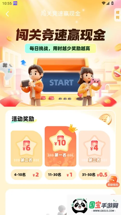 1、首页,点击闯关赢奖励板块就进入,可以挑战游戏内容获得红包奖励